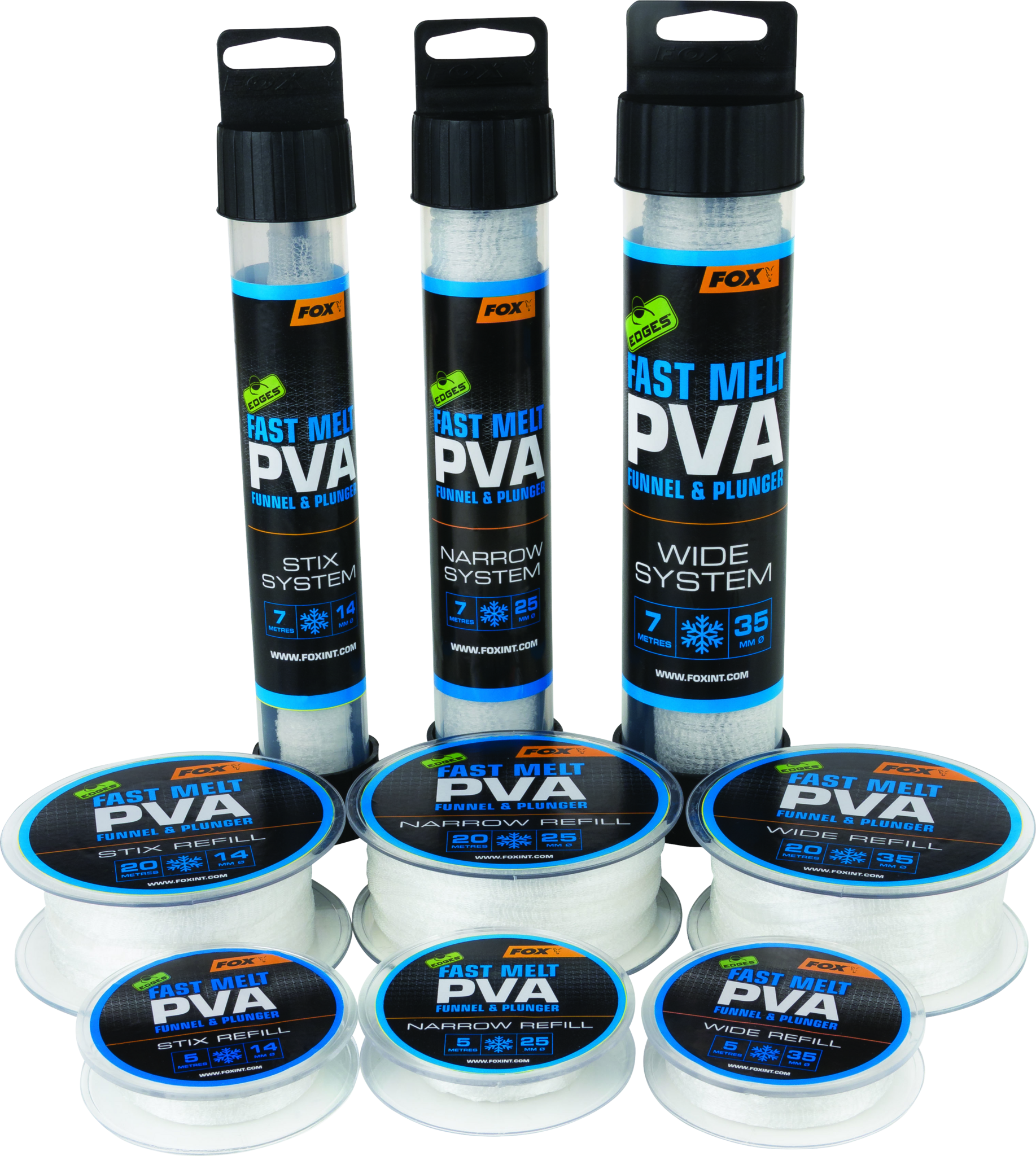 Fox Edges Fast Melt PVA-netsystem Stix 14 mm med anti-stigenet. Komplet system med 7 m net, tragt og stempel i et opbevaringsrør.