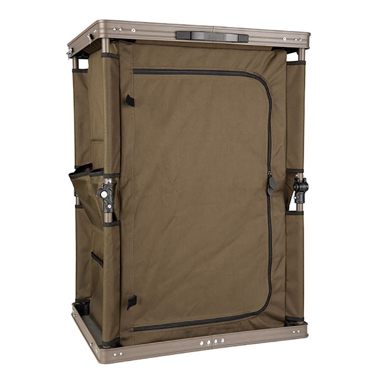 Hvis du vil organisere dit bivvy eller madlavningstelt perfekt, hjælper Fox Session Storage dig med at gøre dette på ingen tid. Denne opbevaring er til opbevaring af madlavningsudstyr eller grej under lange sessioner, opbevaringen er nem at folde ud og har en utrolig kompakt transportstørrelse. Den har også justerbare ben og toppen kan bruges som bord. Interiøret har tre opbevaringsrum, og udvendigt har lommer på begge sider. Stellet har en kaki farve og stoffet er mørkegrønt 210D materiale.