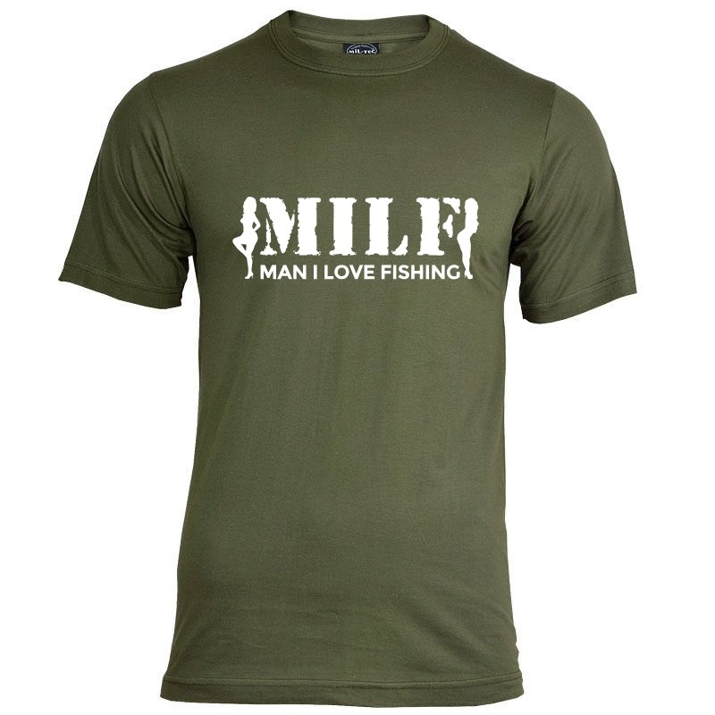 MILF aka 'Man I Love Fishing'. En cool T-Shirt med et stort blink ;) T-Shirt har den yndlings olivengrønne farve og fås med sort/hvid print.