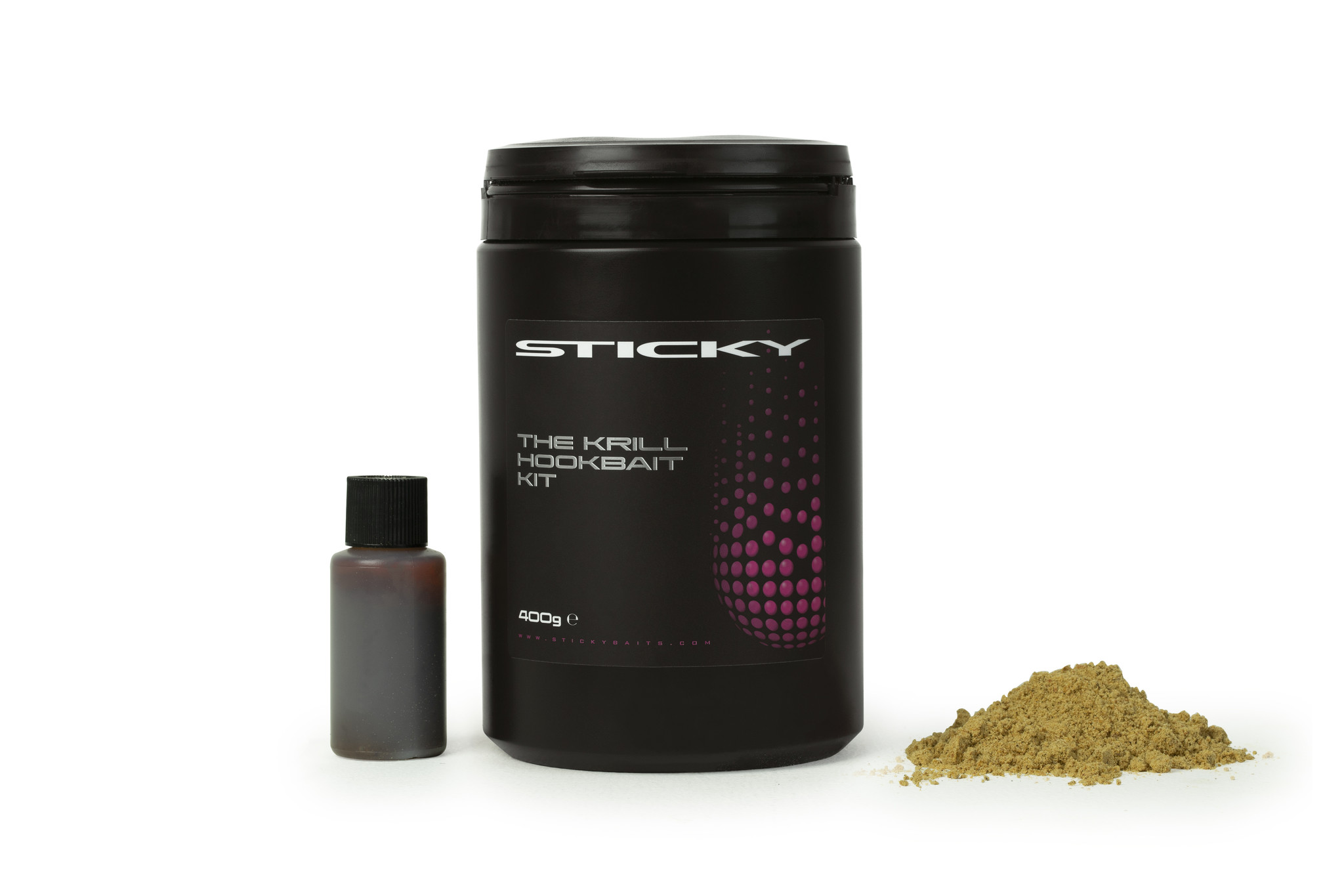 Hvert Sticky Baits Krill Hookbait Kit kommer i en 400 g balje med matchende væsker.