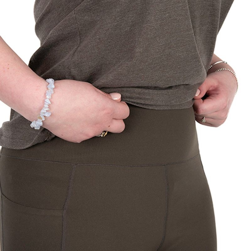 Eine bequeme, dunkelgrüne Leggings mit zwei Oberschenkeltaschen und hohem Bund.