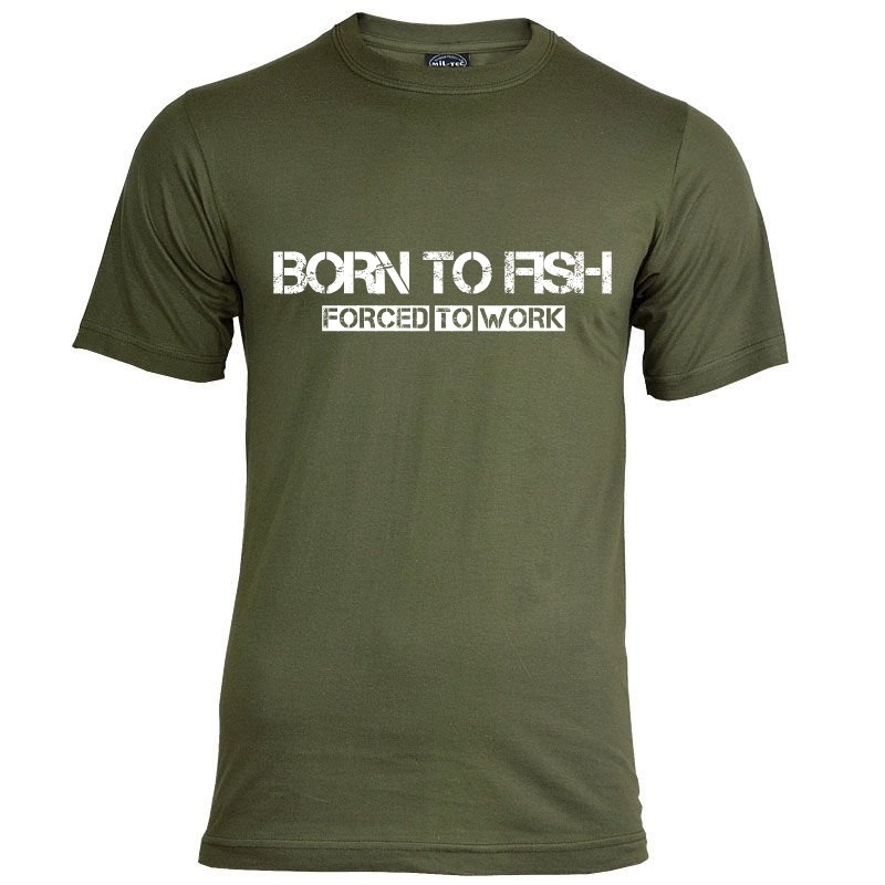 Born To Fish - Forced to work. That is unfortunately the case for most of the carp anglers! Let everyone know with this T-Shirt ;) The olive green T-Shirt is available with black and white print.