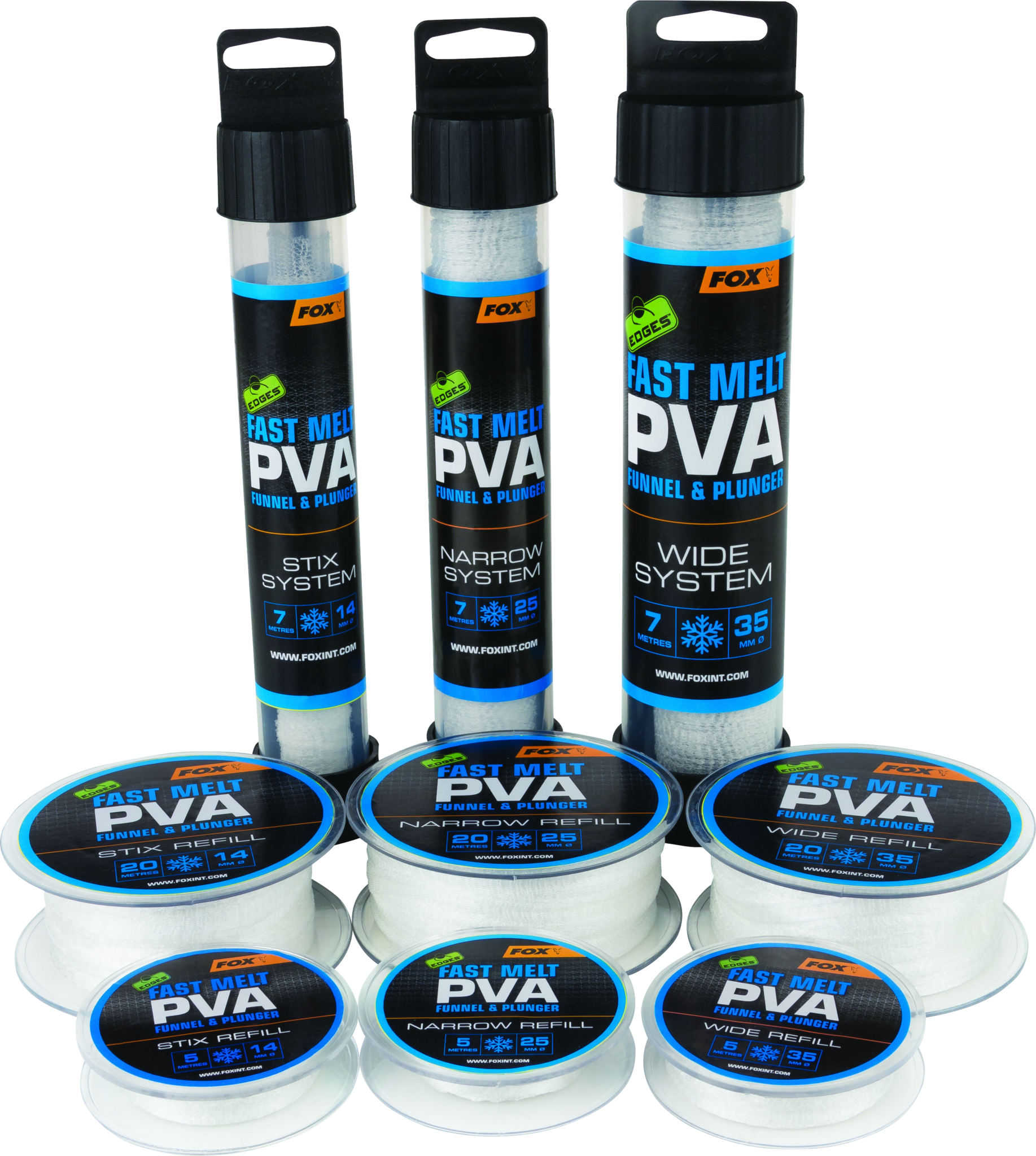 The Fox Edges Fast Melt PVA Mesh System Stix 14mm is a complete system for making compact PVA sticks around your rig. The high-quality anti-ladder PVA mesh prevents the mesh from laddering or tearing during filling, ensuring you can always make reliable PVA sticks.