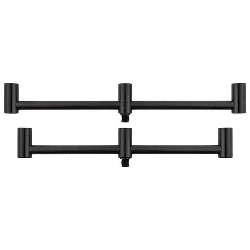 Barras de zumbido delgadas de carbono 3K y aluminio anodizado negro para fijar alarmas de picada, apoyos de caña y apoyos de talón. Los montantes de 12 mm de diámetro, que combinan a la perfección con las picas y barras de zumbido Black Label Carbon, son