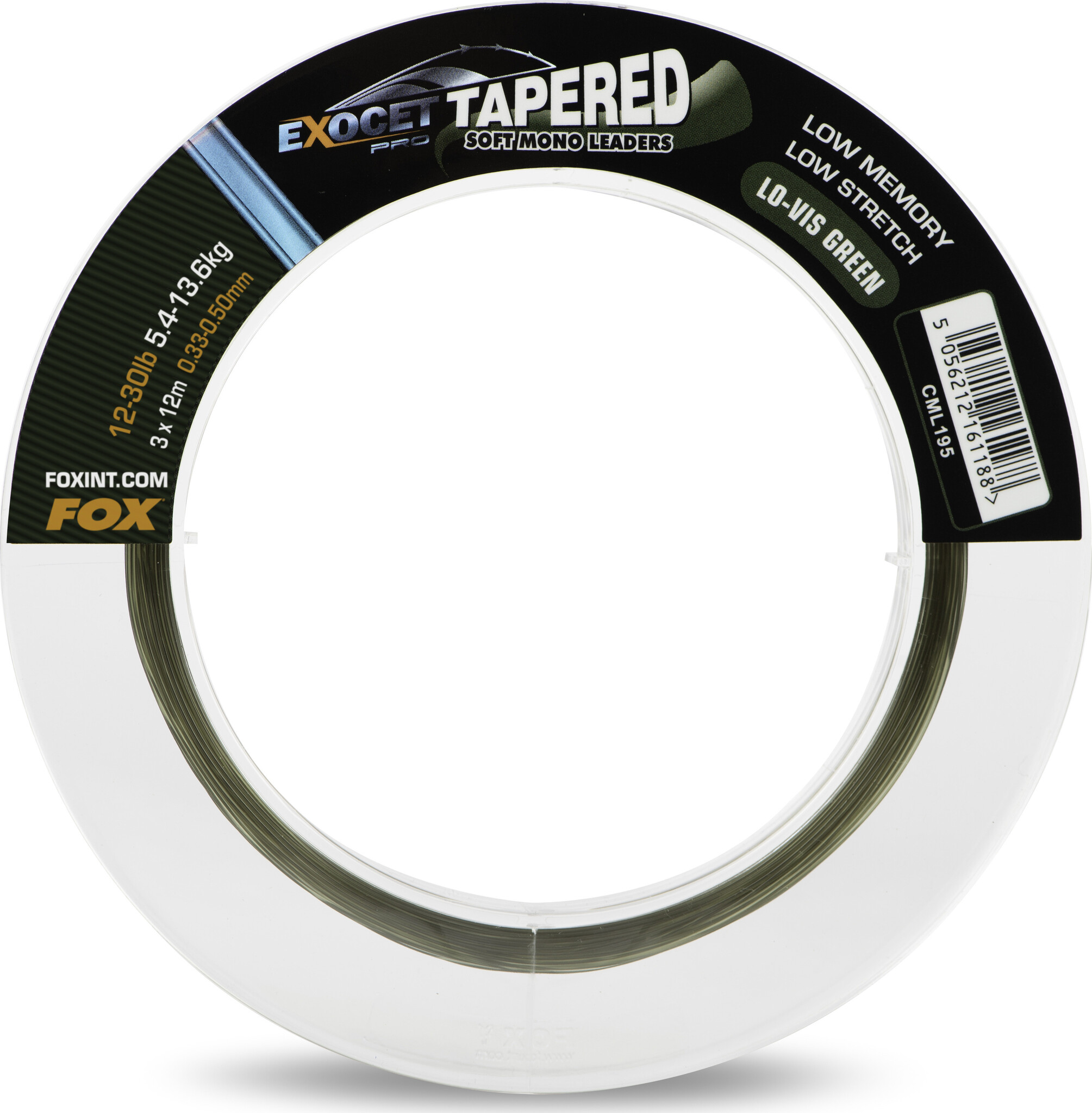 Líderes cónicos Fox Exocet Pro de 12 a 30 lb, color verde de baja visibilidad. Líderes monofilamento lisos para lances largos, alta resistencia a la abrasión y camuflaje perfecto. 3 piezas.