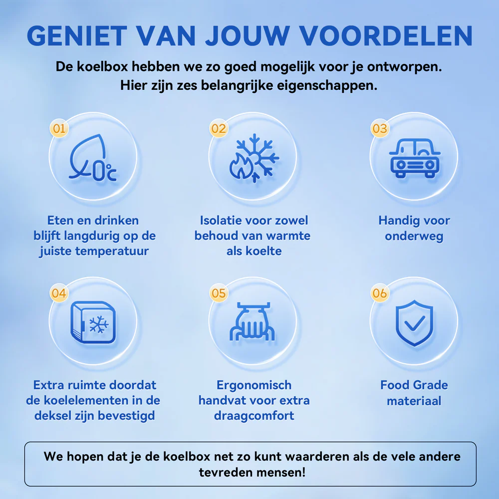Con una capacidad de refrigeración de hasta 40 horas, le garantizamos una refrigeración duradera, incluso en los calurosos días de verano. El refrigerador Brisby también puede retener el calor hasta 18 horas, lo que le permite disfrutar de comidas o bebidas calientes incluso en días fríos.
