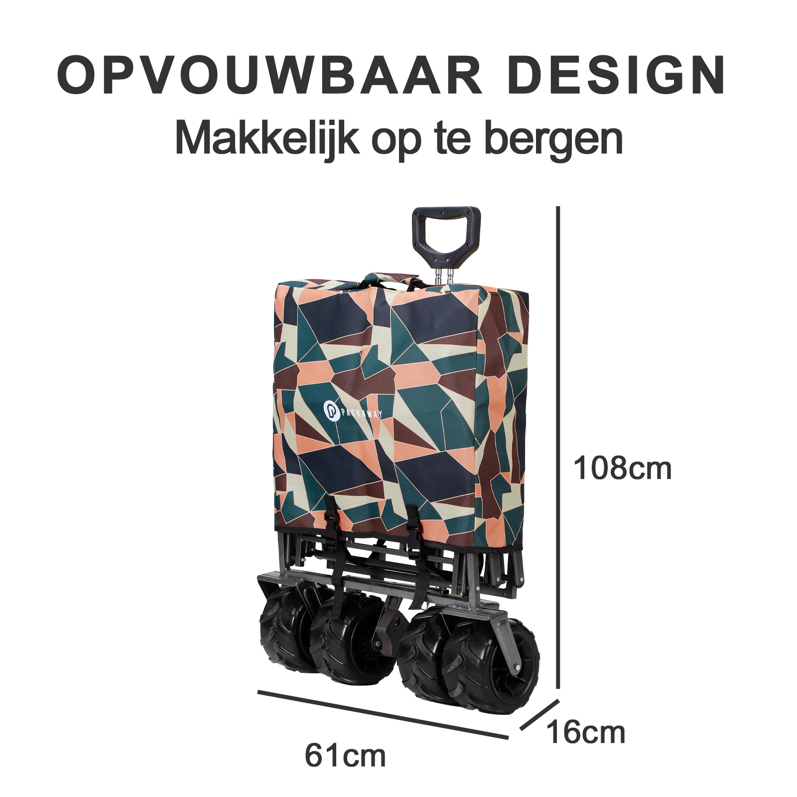 Este práctico remolque plegable está equipado con grandes ruedas todoterreno giratorias de 360° (18 cm de diámetro x 10 cm de ancho) y también se puede usar en la arena de la playa. El asa ajustable se extiende hasta 107 cm y se bloquea a la longitud deseada.