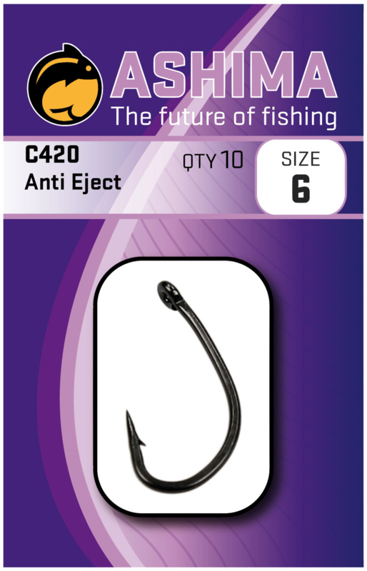 L'hameçon anti-éjection 420 pique rapidement et donc le risque que le poisson soit relâché est minime. Parce que la pointe du crochet est vers l'intérieur, elle reste affûtée plus longtemps sur les fonds de gravier ou de sable. Cet hameçon est également très utilisé sur les plans d'eau de dressage. Les crochets anti-éjection 420 ont un revêtement noir mat développé par Ashima.