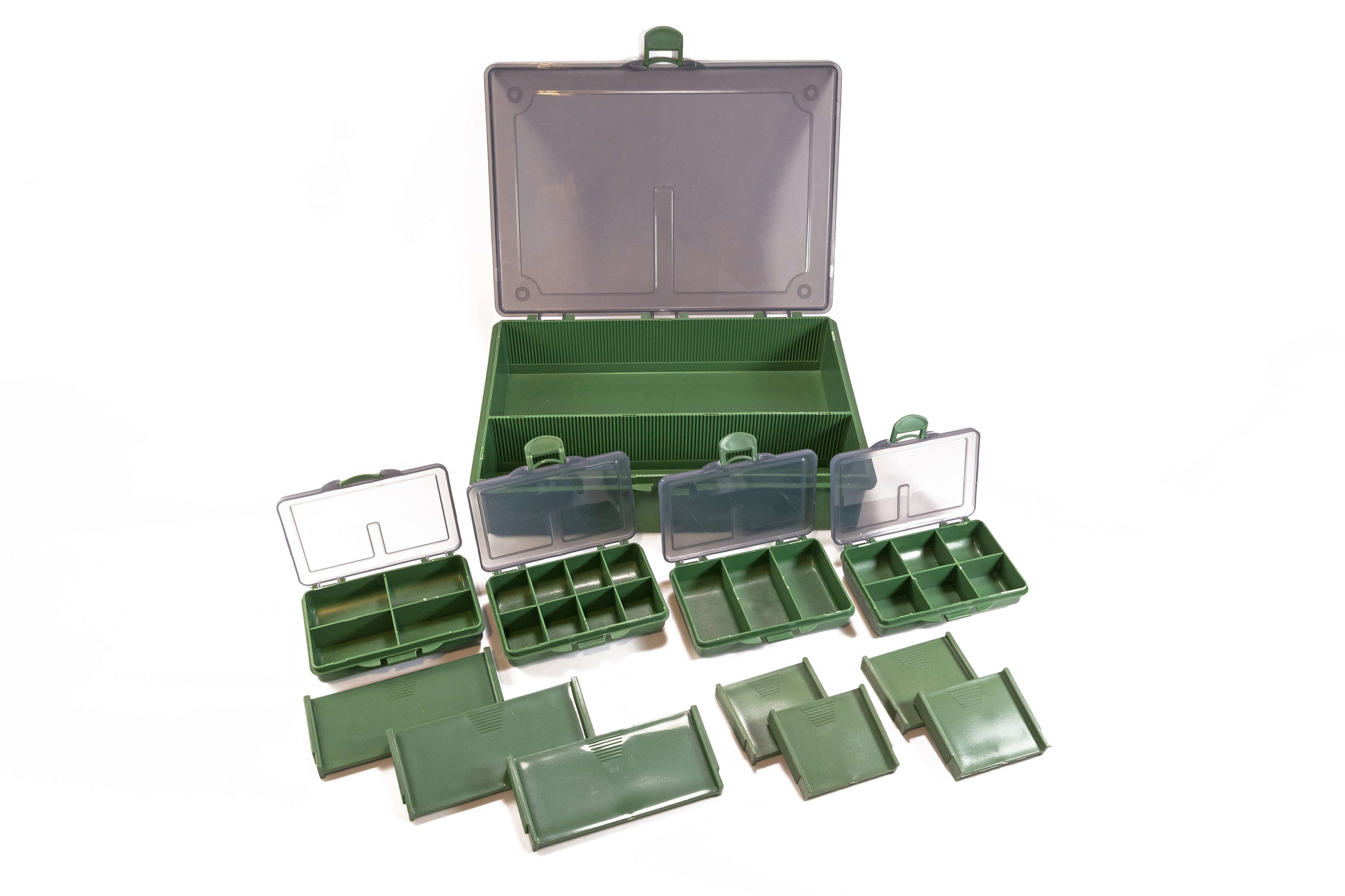 Construction en plastique nylon renforcé et résistant aux chocs, couleur vert mat avec dessus semi-transparent de fumée de pistolet, séparateurs internes amovibles pour changer la taille des compartiments, compact : L27cm H6cm P20,5cm, moyen : L35cm H6cm