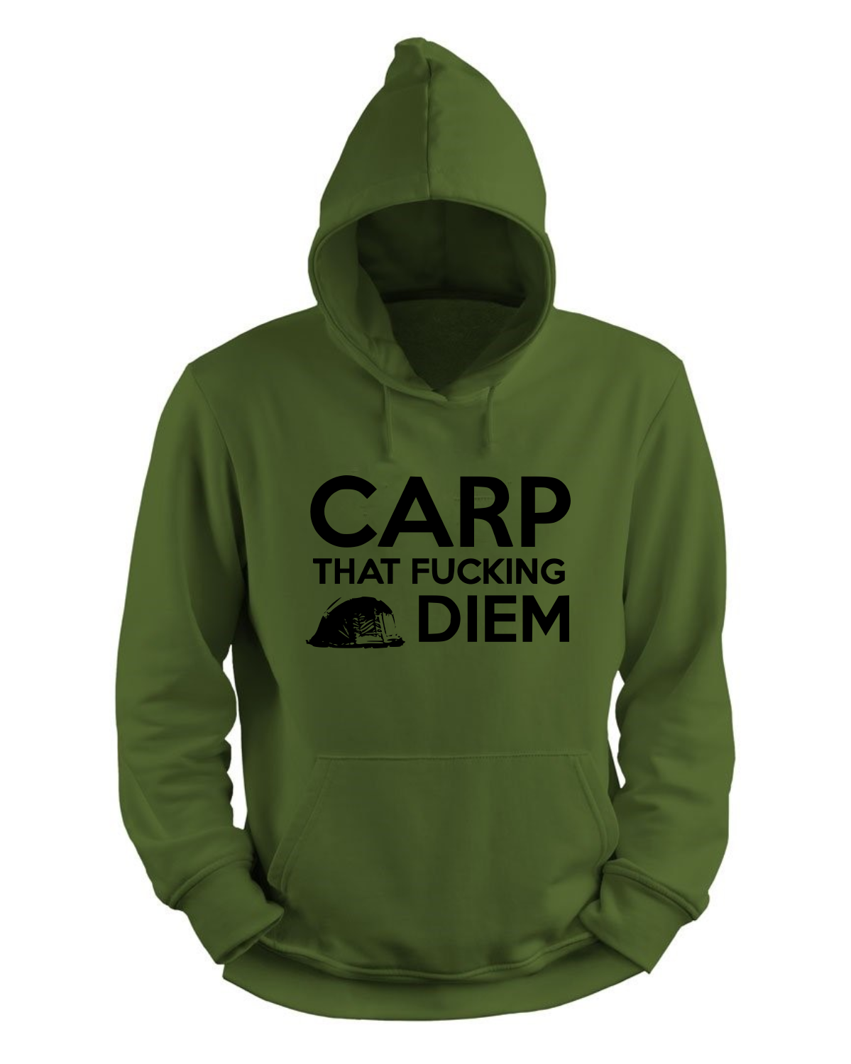 E così è... Cogli l'attimo e vai a pescare! Realizza il motto sulla nostra comoda felpa con cappuccio.