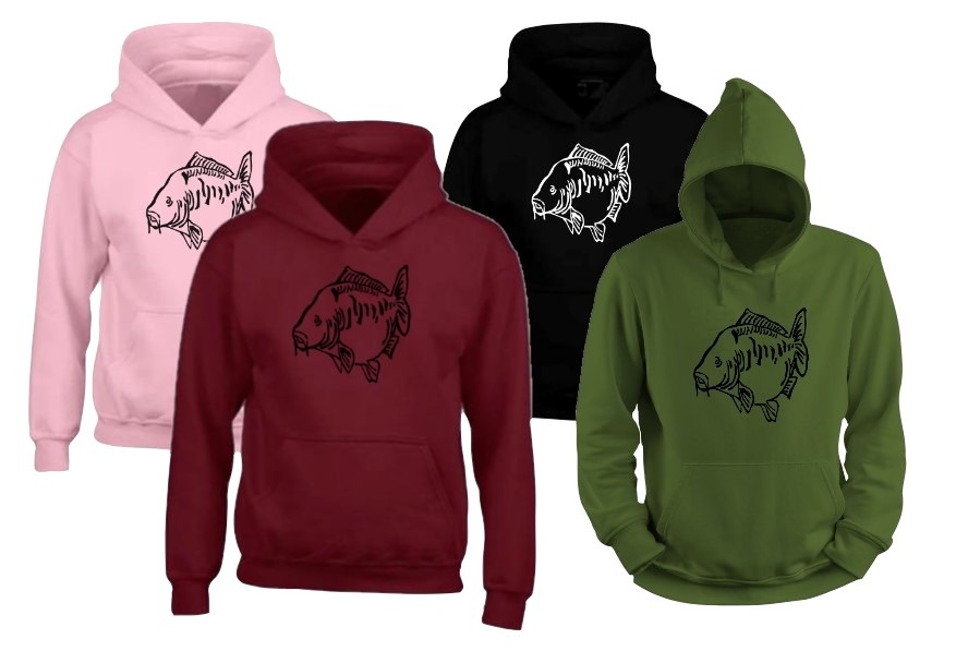 Per i pescatori che amano gli specchi spessi e belli, c'è una fantastica felpa con cappuccio di House of Carp con una fantastica stampa di carpe specchiata in nero sul davanti.