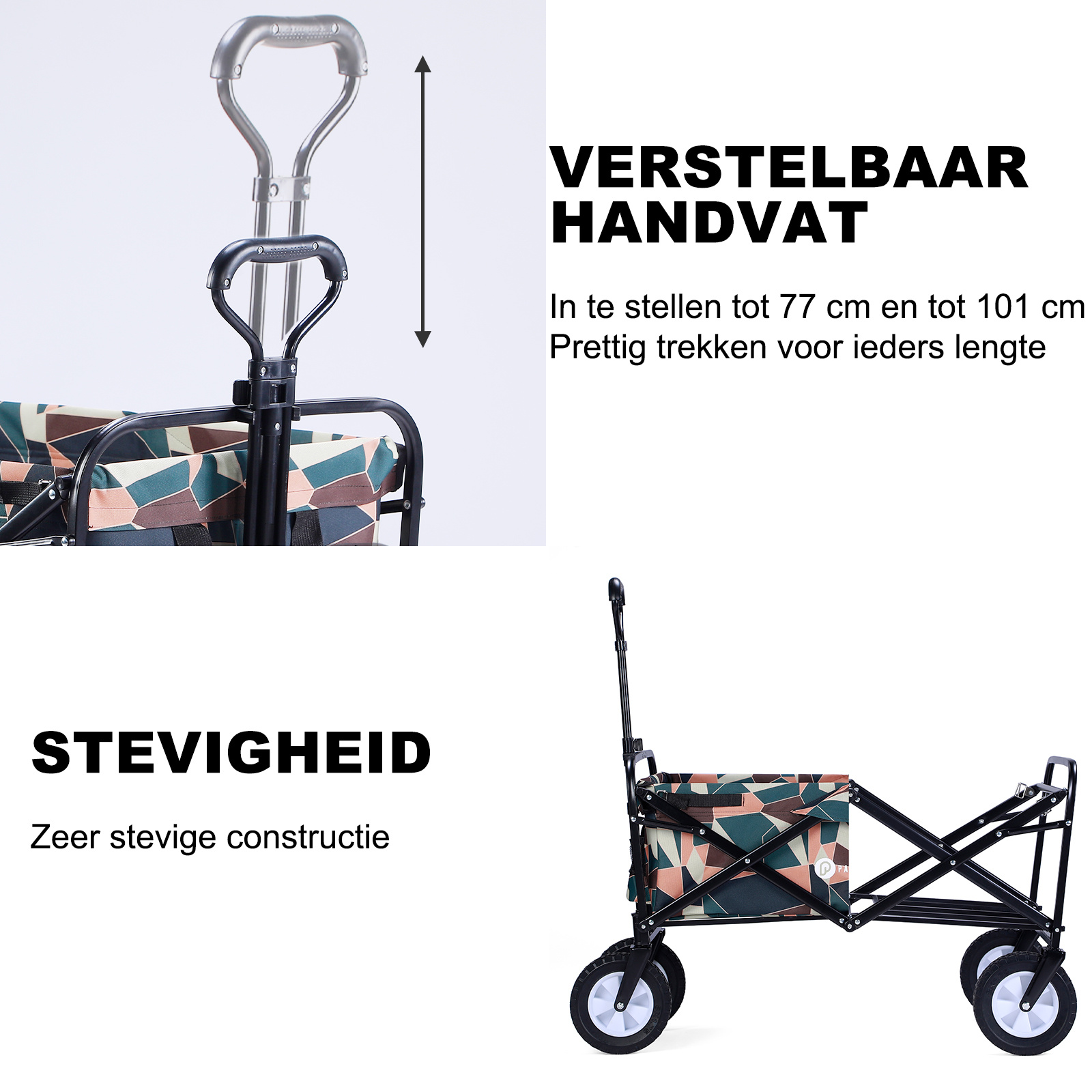 Deze handige vouwwagen is uitgerust met grote, 360° draaibare terreinwielen (diameter 18cm x breedte 10cm), kan ook worden gebruikt op strandzand. En het verstelbare handvat kan worden verlengd tot 107 cm, het kan worden vastgezet op de gewenste lengte.