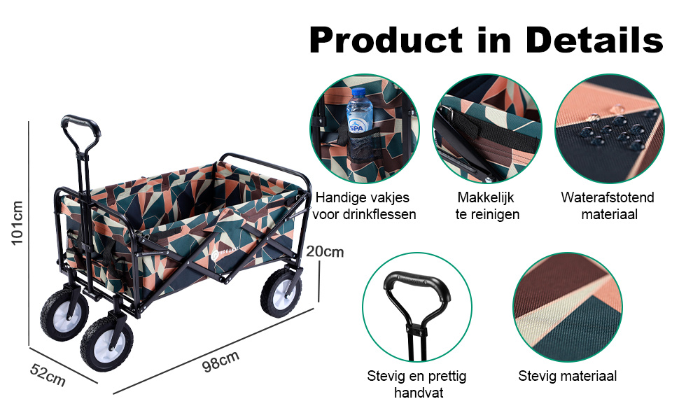 Deze wagen is perfect voor buitenreizen, strandvakanties, kamperen, tuinieren en winkelen. Wij bieden 2 JAAR GARANTIE op alle onderdelen op de bolderkar. We bieden ook een 100% risicovrije tevredenheidsgarantie, als je er niet tevreden mee bent, zullen we graag terugbetalen.