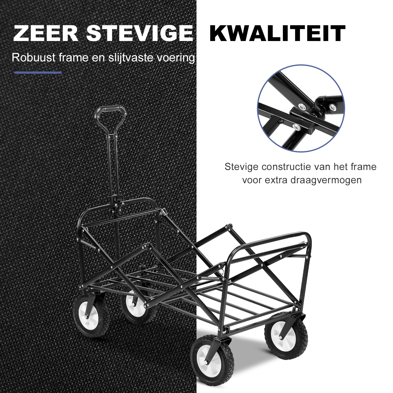 Deze handige vouwwagen is uitgerust met grote, 360° draaibare terreinwielen (diameter 18cm x breedte 10cm), kan ook worden gebruikt op strandzand. En het verstelbare handvat kan worden verlengd tot 107 cm, het kan worden vastgezet op de gewenste lengte.