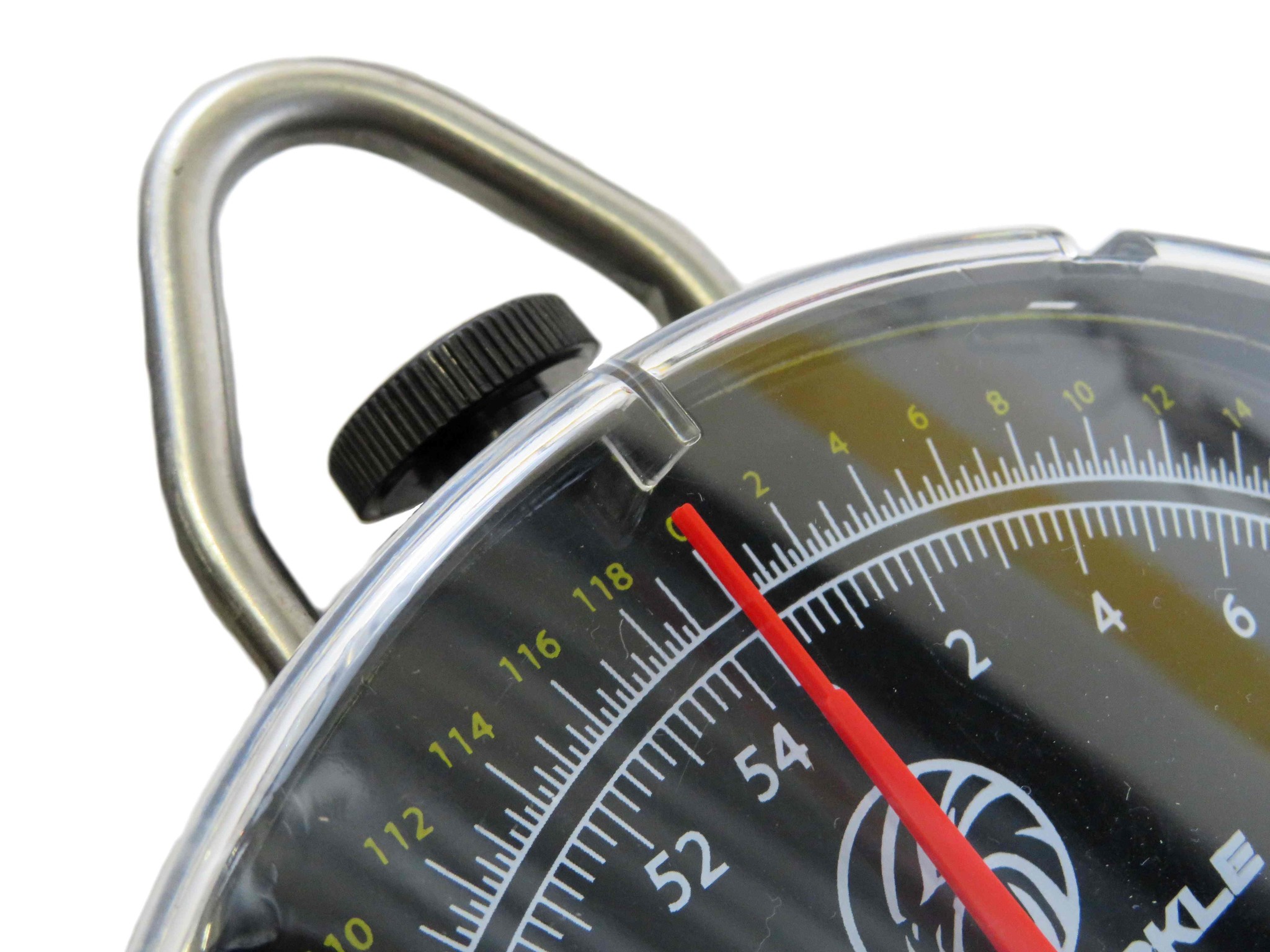 Een uiterst nauwkeurige en mooie analoge weegschaal die zowel in ponden als in kilo's het gewicht aangeeft. Met de verstelknop aan de bovenzijde stel je de klok in op 0 om een eventuele gewichtstoename bij gebruik van een weegzak te compenseren.